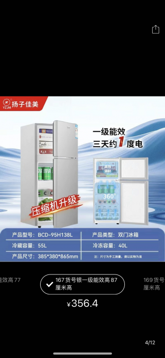 一级变频超省电,面板高级大气。冷藏55L+冷冻40L,功能完好,无维修记录,外观无损无刮。原价356,现价200。同城自提。
