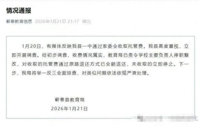 1月20日,有媒体反映我县一中通过家委会收取托管费。我县高度重视,立即开展调查。经初步调查,收费情况属实,教育局已责令学校主要负责人停职整改,对收取的托管费通过原路退还方式已全额退还,未收取的立即停止。下一步,我局将举一反三全面排查,对类似问题依法依规严肃处理。